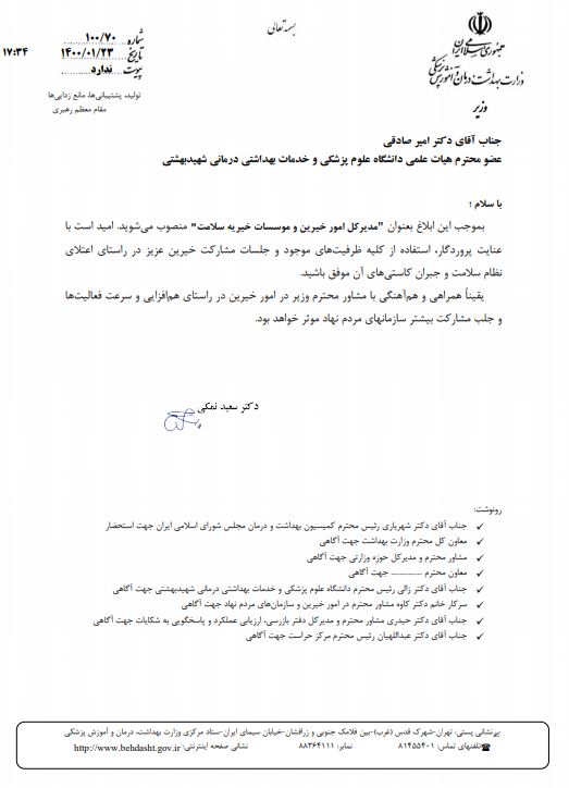 به موجب این ابلاغ به عنوان مدیر کل امور خیرین و موسسات خیریه سلامت منصوب می شوید. امید است با عنایت پروردگار، استفاده از کلیه ظرفیت های موجود و جلسات مشارکت خیرین عزیز در راستای اعتلای نظام سلامت و جبران کاستی های آن موفق باشید.