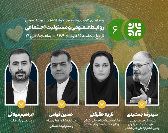 دانستنی اقتصاد:ششمین وبینار از سلسله نشست‌های تخصصی «ارتباط‌گر» با محوریت روابط‌عمومی و مسئولیت اجتماعی، با حضور چهار چهره دانشگاهی و اجرایی این حوزه یکشنبه ۱۶ آذر ۱۴۰۴ برگزار می‌شود.